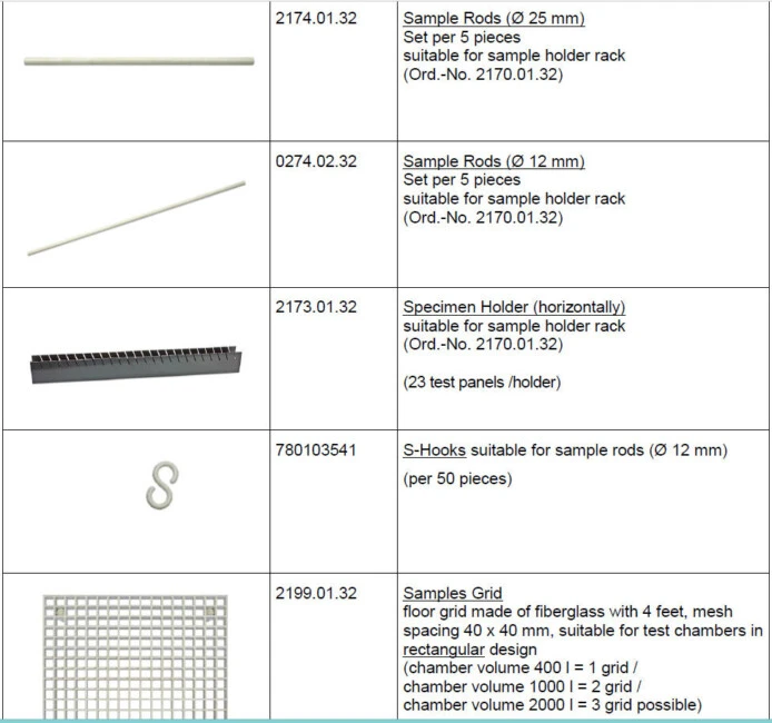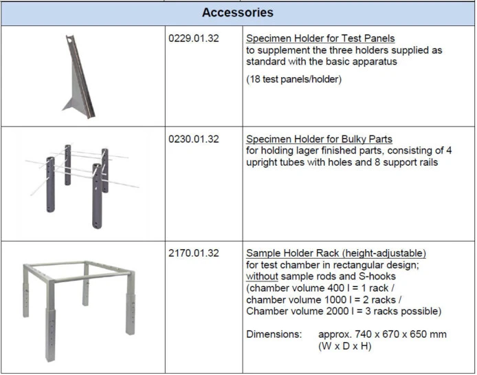 The scope of supply includes 3 specimen holder for weathering panels (per test chamber), with test capabilities of 18 test panels per specimen holder.