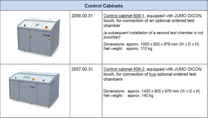 For this purpose, two control cabinets are available, either for the equipment with one test chamber (Model 606-1) or as double chamber device (Model 606-2).