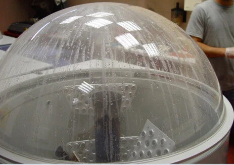 The top of the test chamber dome is pneumatically opened and closed so that both hands can be used to lodge the specimens. A dosing pump serves for an infinitely variable adjustment to achieve optimum consumption of spray solution. The large storage tank for approx. 200 l salt solution allows continuous testing without attention over a period of up to a week.