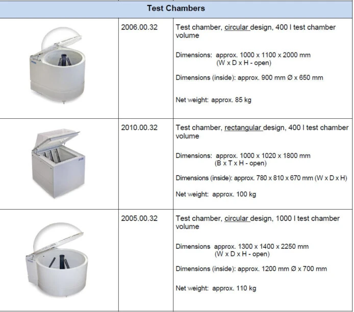 The test chambers (400 l and 1000 l) are available in circular and rectangular design.