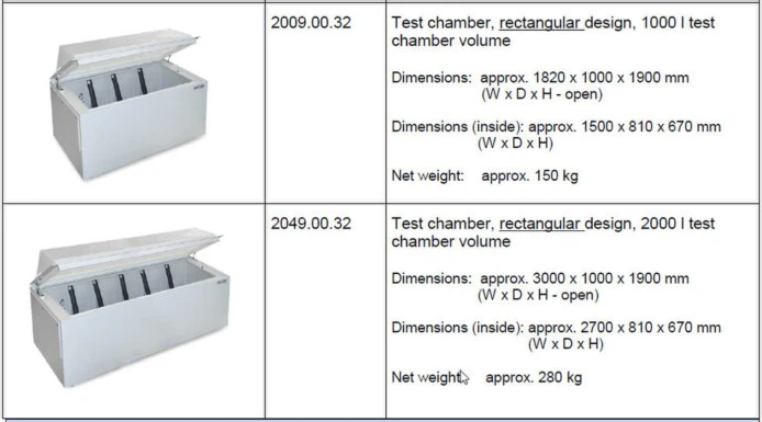 Test chamber in rectangular desig with 1000 l test chamber volume.