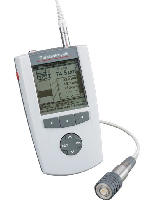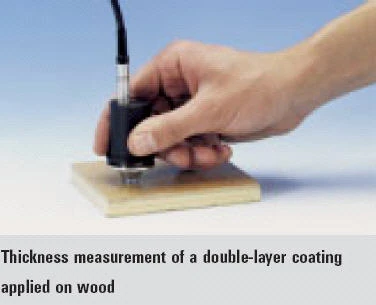 The thickness of paint, lacquer and plastic coatings applied on metals, plastics, wood, glass and ceramics substrates is measured with high precision and shown on a large display.