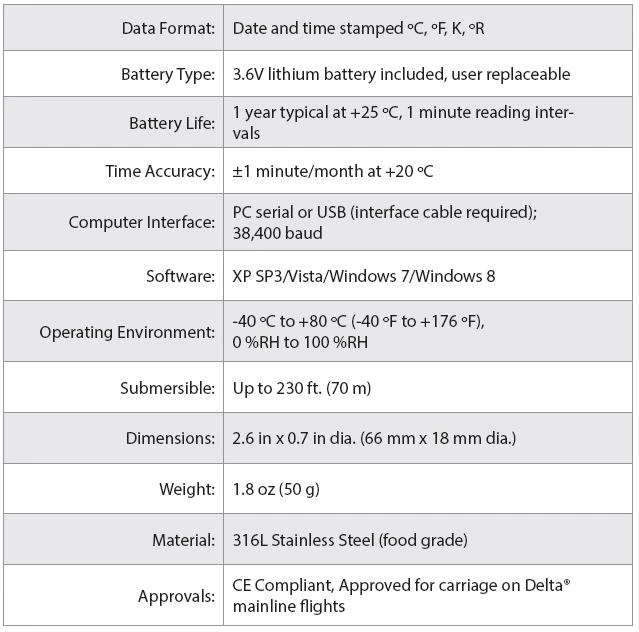 Its food grade stainless steel casing makes it inert to most common fluids and gasses. It operates with user-replaceable batteries for up one year typical use) and downloads data (32,767 readings) quickly to your PC.
