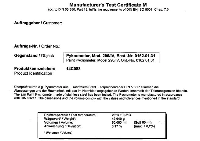 The standard ERICHSEN Pycnometers are made to a tolerance of 0.2 %. Upon request and at an extra price, all instruments can be made to a tolerance of 0.1 % and supplied with a certificate of the Official Bureau of Weights and Measures.