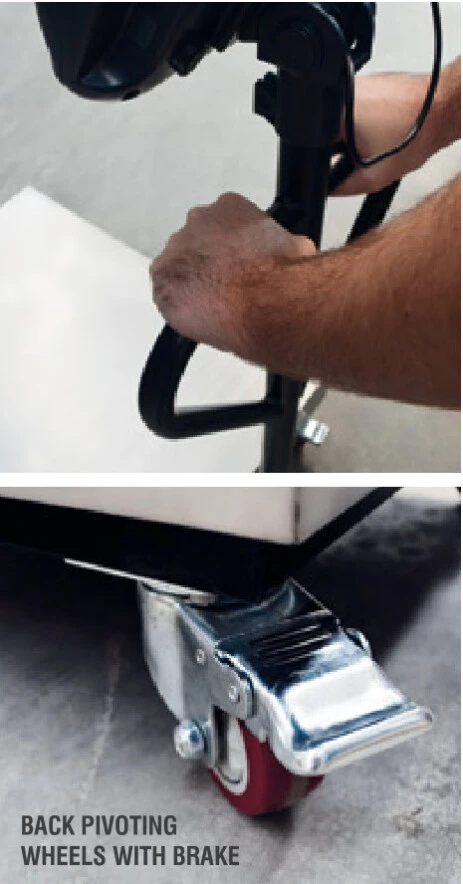 Includes pivoting wheels with brake to evoid movement during the weighing process.