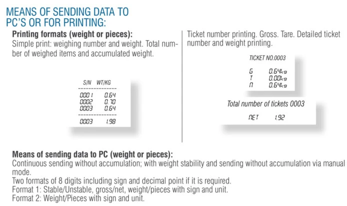 • Accumulation and manual data transmission to PC or printer; zero or tare.
