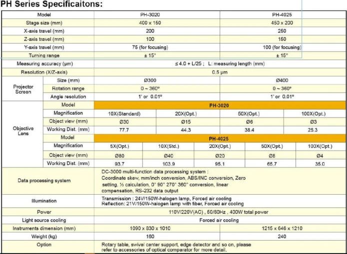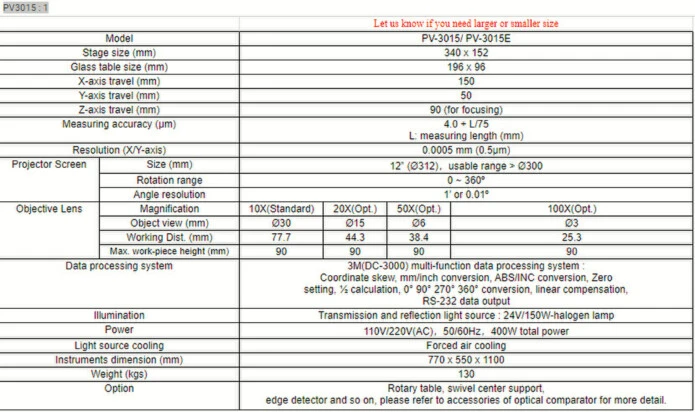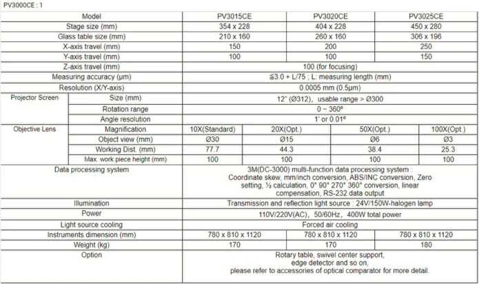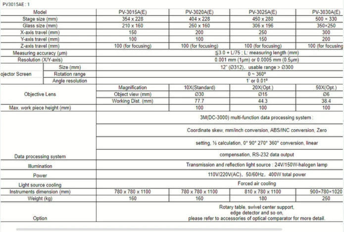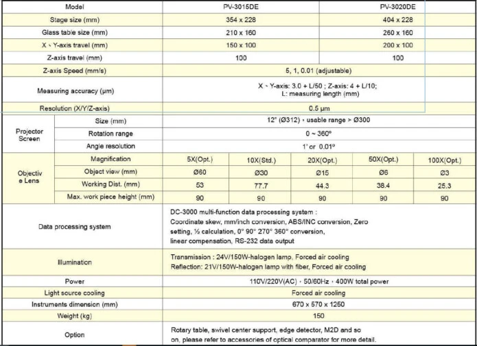 PV-3000DE Series Digital Optical Comparator the Z-axis uses stepper motor drive, electric focusing, simultaneously increasing the count in theZ-axis grating, ladder components can be measured, greatlyi ncreased the performance. In addition, PV-3000DE Series projectors, the lens magnification is complete, customers can measure according to the different objects match different lens.
