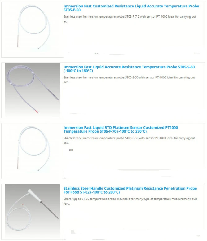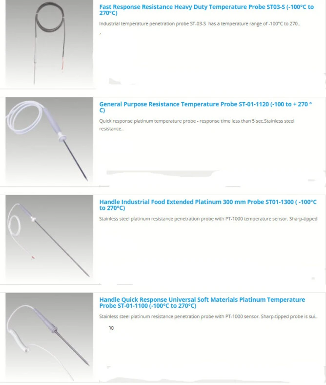 Water liquid catering digital thermometer DT-1 is as standard supplied with permanently attached ST01-1100 food penetration sharp-tipped probe 3.3x100mm with PT-1000 sensor and a one meter length curly cable.