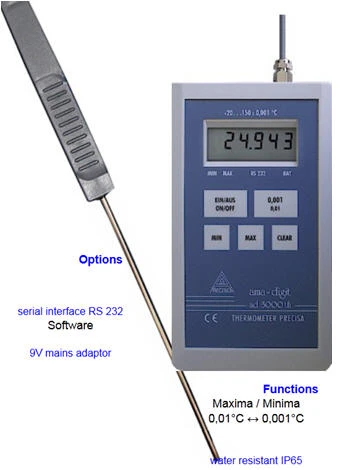 The first electronic hand-held thermometer with finest resolution 0,001°C for high specialised measuring tasks.