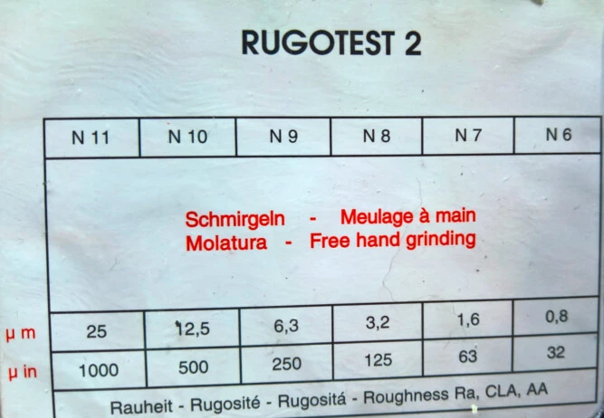 Metal plate, enabling the roughness of shot-blast surfaces to be determined visually and by touch. 6 surface conditions are represented on it, corresponding to the results obtained with round shot (A) and angular shot (B). The 3 roughest areas are also classified into fine or coarse grain. Supplied with a conversion table between French, Swiss and Ra units into μm or μ inch.