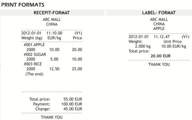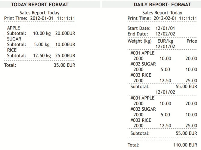 - Printouts: PLU Report, Daily sales report, Daily purchase report, Inventory Report, Lack inventory Report, Label, Receipt.