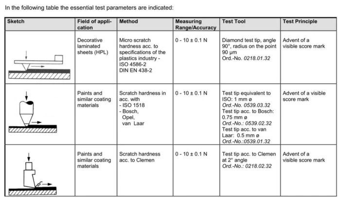 Various types of scratch tools, ranging from sharp pointed to rounded and flat with sharp-edges are available so that the test can mimic the scratch effects to be allowed for under practical conditions to represent the product properties over as wide a range of conditions as possible.