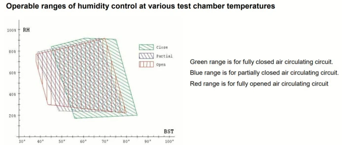 Ultrasonic humidifier is proportionally controlled so to reach and maintain the programmed test condition. Air circulation may be modified by the user; in full closed circuit mode humidity is obtained in extreme high range with negligible water consumption and BST is in medium high range.