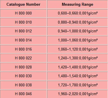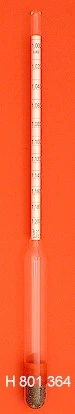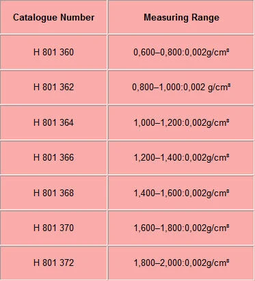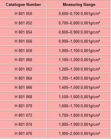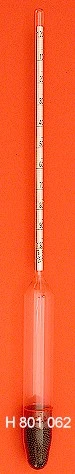 Density hydrometers without thermometer, measuring span 0,150g/cm³ and 0,250g/cm³, scale graduation 0,005g/cm³, measuring range 0,700 upto 2,000g/cm³.