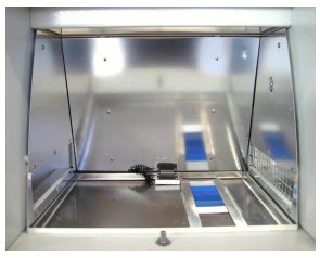 The light of the xenon lamp is filtered by an installed optical UV filter and is evenly distributed in the specimen holder tray by a parabolic reflector and suitably shaped and highly reflective walls. A fan cools the lamp and the exposure chamber.