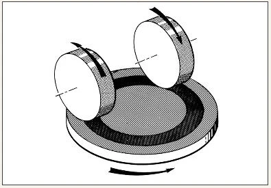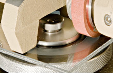 of the specimen against the sliding rotation of two abrading wheels cause wear while a vacuum system