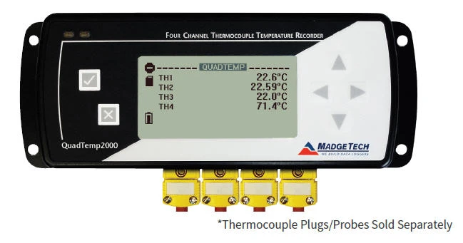 The QuadTemp2000 is a four channel thermocouple temperature data logger with an LCD. The device features onscreen minimum, maximum and average statistics, as well as a user configurable graphics screen that allows for any combination of channels to be displayed. The device accepts J, K, T, E, R, S, B and N type thermocouples. The QuadTemp2000 is ideal for a variety of applications, whether it is remote temperature monitoring, or multiple points in a central location.