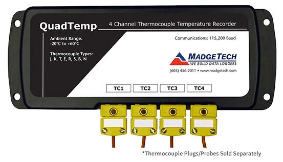 The QuadTemp is a four channel thermocouple temperature data logger with a reading rate of up to 4 Hz. It can measure and record data for up to 500,000 readings per channel. To maximize memory capacity, users can disable unused channels to add additional memory onto enabled channels. For easy identification, each channel can be named with up to a ten digit title. In addition, the QuadTemp features individual cold junction compensation for each channel providing increased accuracy and response time, and if a probe is removed or severed during logging, the software automatically annotates the data.