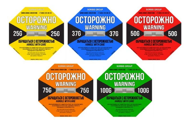 Shock indicators - single-use numbered devices fixed outside the box with the goods.