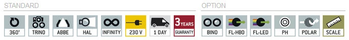 The following optional accessory items are available: Various eyepieces, lenses, a complete polarisation kit, a condenser with pivoting lens, various kits for phase-contrast microscopy as well as complete HBO and LED fluorescence kits etc.