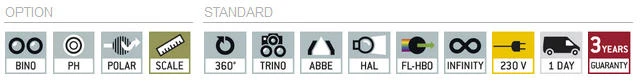 The following optional accessory items are available: Various eyepieces, lenses, a complete polarisation kit, a phase-contrast unit as well as complete HBO and LED fluorescence kits etc.