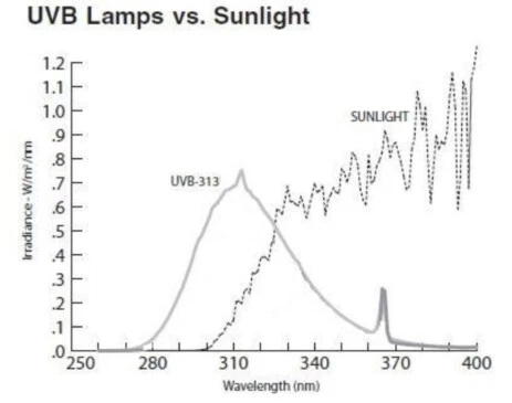 UVB-313 lamps maximize acceleration through the use of the most aggressive UV short waves compared to those normally arriving on the earth's surface.