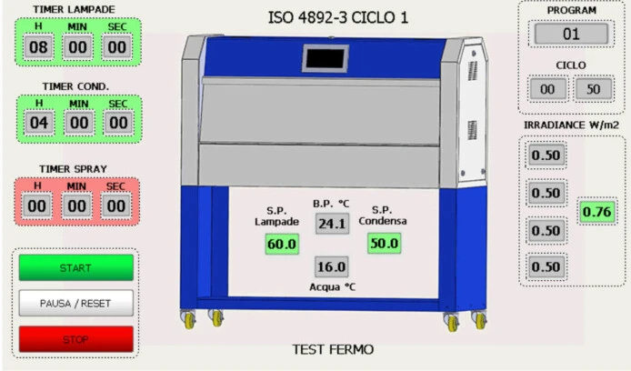 To simulate aging due to external atmospheric agents, UV BOX subjects the materials to alternating cycles of UV radiation and humidity at controlled high temperatures. The instrument simulates the effects of sunlight through the use of special UV fluorescent lamps and the simulation of the effect of dew and rain occurs through condensation or a spray of water (Spray option).