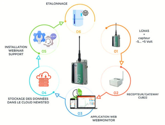 Newsteo offers its range of dataloggers to connect different types of sensors. After connecting the sensor, measurements can be wirelessly transmitted and sensors are then connected to a wireless sensor network.