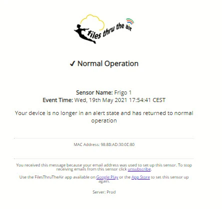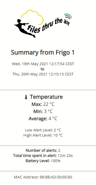 In addition to this, the device can send a scheduled summary email detailing minimum, maximum and average temperature, as well as battery level, number of alerts, and total time spent in alert.