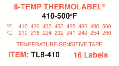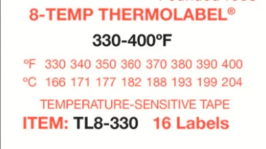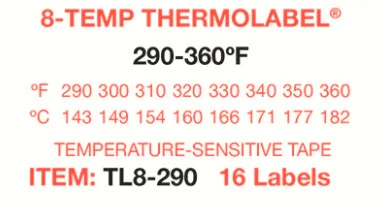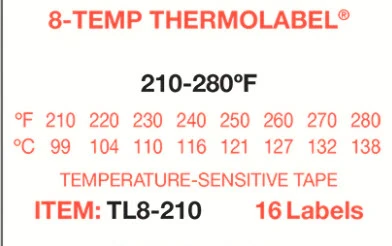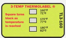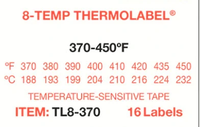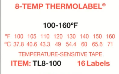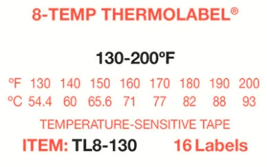Our water resistant 8-Temp Thermolabel temperature label features temperature sensitive elements that produce a non-reversible white to black color change at the rated temperature.