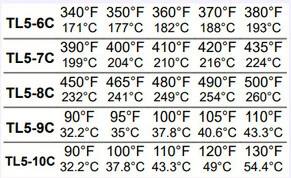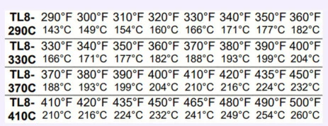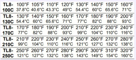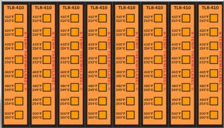 Our 8-Temp Thermolabel Classic products feature eight incremental temperature sensitive elements that produce a nonreversible white to black color change at their rated temperatures.