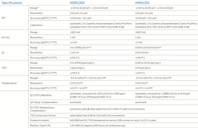 The HI991301 and HI991300 are supplied with an amplified polypropylene body pH/EC/ TDS/temperature probe.