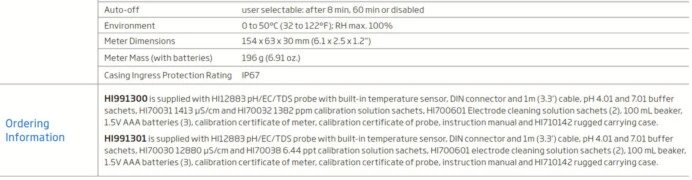 The HI991300 and HI991301 are light weight, portable pH, conductivity (or total dissolved solids) and temperature meters for portable applications requiring both a pH and conductivity (or TDS) measurement.