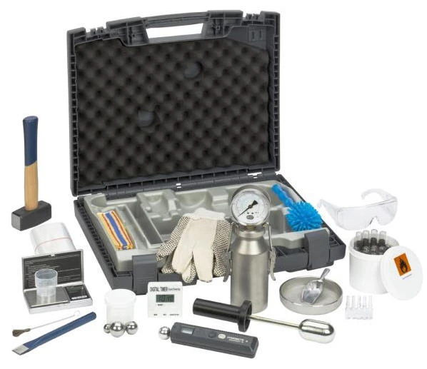 The case set is more extensively equipped however. Amongst other things it contains the Hydromette Compact B moisture indicator to reduce the number of individual CM measurements necessary, to scan larger surfaces quickly and efficiently and to achieve a significantly higher level of test reliability. The preliminary test unit works non-destructively using a high frequency field.