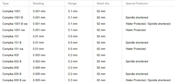 The following quality features characterize our manufacturing programme of Comparator Gauges Compika: