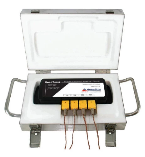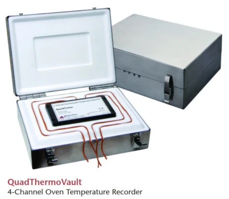 The QuadThermoVault is a four channel thermally insulated, battery powered, oven temperature data logger able to withstand extreme temperatures. It can withstand oven temperatures of up to 350 °C (662 °F) for up to 25 minutes when properly sealed. Its stainless steel enclosure and thermal properties lend itself to be the ideal temperature data recorder for applications such as powder coating cure ovens, wet coating cure ovens, batch ovens and conveyor ovens. The external thermocouple probes provide accurate temperature measurements with fast response times.