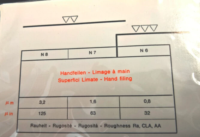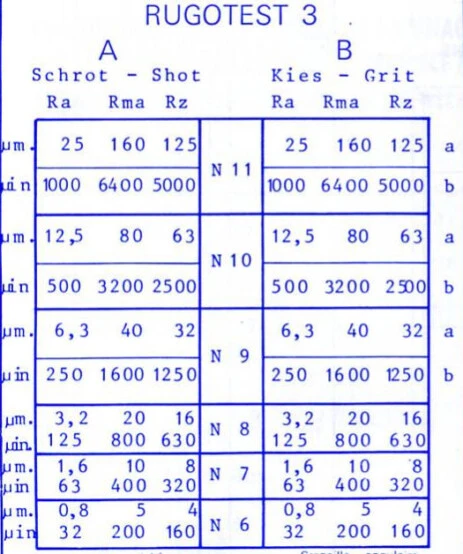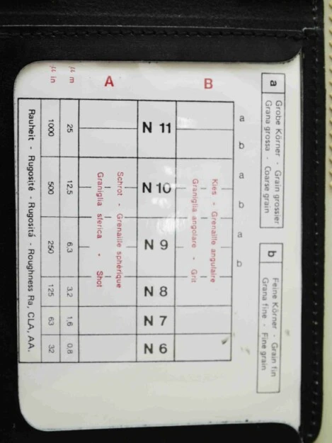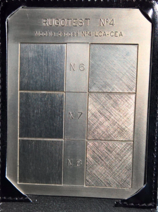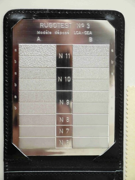 Metal plate, enabling the roughness of shot-blast surfaces to be determined visually and by touch. 6 surface conditions are represented on it, corresponding to the results obtained with round shot (A) and angular shot (B). The 3 roughest areas are also classified into fine or coarse grain. Supplied with a conversion table between French, Swiss and Ra units into μm or μ inch.