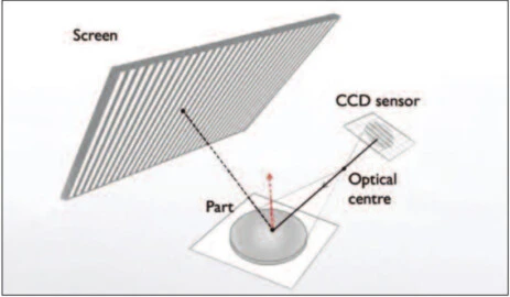 The sinusoidal waveform acts like a ruler on the surface allowing the X, Y and Z ordinates to be mapped as they are proportional to the spatial phase of the reflected sinusoidal pattern profile.