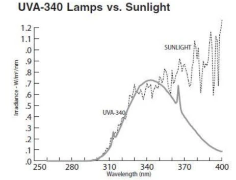 UVA -340 lamps offer the best simulation of sunlight in the critical wavelength region from 365 nm up to the solar cut-off value of 295 nm.