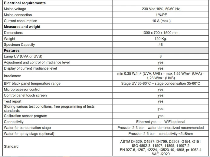 To simulate aging due to external atmospheric agents, UV BOX subjects the materials to alternating cycles of UV radiation and humidity at controlled high temperatures. The instrument simulates the effects of sunlight through the use of special UV fluorescent lamps and the simulation of the effect of dew and rain occurs through condensation or a spray of water (Spray option).