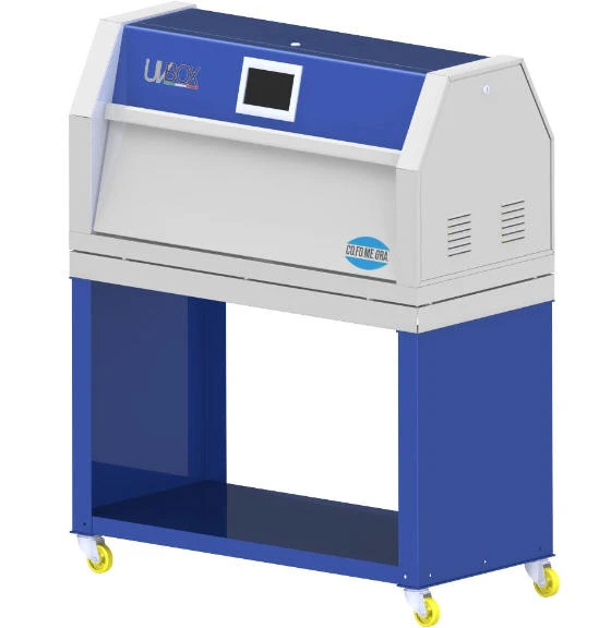 exposed to the external environment. The fluorescent lamps used in the UV BOX simulate critical UV short waves and realistically reproduce the damage caused by sunlight. The types of damage that can be simulated with the UV BOX are the following: color change, loss of gloss, chalking, cracking, cracks, blistering, veiling, brittleness, loss of strength and oxidation.