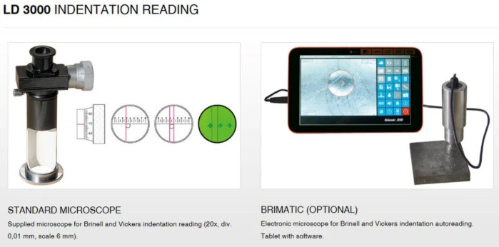 Feasible tests | LD 3000: Only indentation LD 3000 A: Automatic indentation reading with onboard LCD and portable probe Brinell HBW 1/10 - 1/30 - 2.5/62.5 - 2.5/187.5 - 5/25 - 5/62,5 - 5/125 - 5/250 - 5/750 - 10/100 - 10/250 - 10/500 - 10/1000 - 10/1500 - 10/3000 Vickers HV 3 - HV 5 - HV 10 - HV 20 - HV 30 - HV 50 - HV 100 (Only indentation) LD 3000 B: Automatic Brinell HBWT and Rockwell measurements Brinell HBWT 2.5/62.5 - 2.5/187.5 - 5/125 - 5/250 - 5/750 - 10/500 - 10/1000 - 10/1500 - 10/3000 Rockwell HRA - HRB - HRC - HRD - HRF - HRG - HRL - HRM - HRR Vickers HV 3 - HV 5 - HV 10 - HV 20 - HV 30 - HV 50 - HV 100 (Only indentation) |