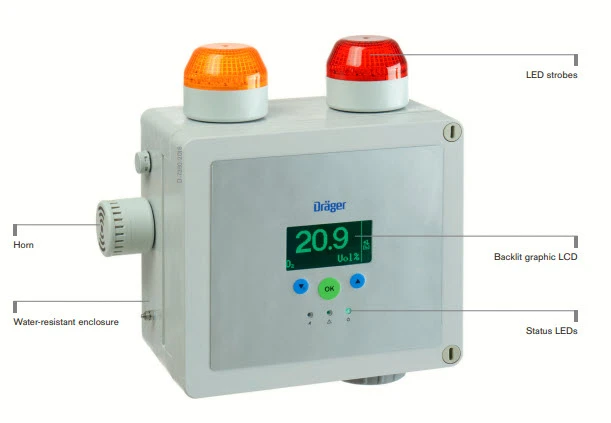 PointGard 2100’s rugged, water-resistant housing comes complete with a horn and strobes, a built-in power supply, and reliable DrägerSensor®.